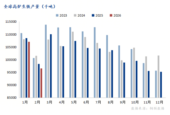 根据世界钢铁协会公布的最新统计数据,2026年2月份全球高炉生铁总产量较2026年1月份相比有所减少,幅度为9.83%,全球直接还原铁产量较2026年1月份相比均有所减少,幅度为15.69%。